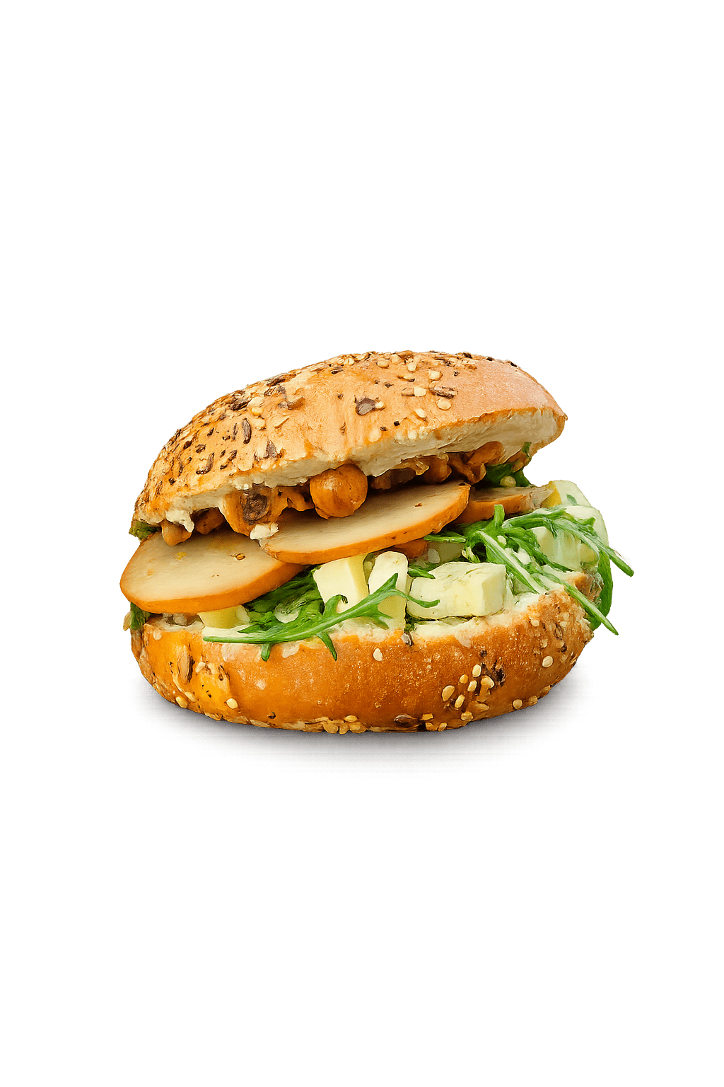 Pain bun’s aux graines, potimarron rôti, brousse de chèvre de la ferme CHOVIN, noisettes grillées, pickles d’oignons rouges, jeunes pousses
